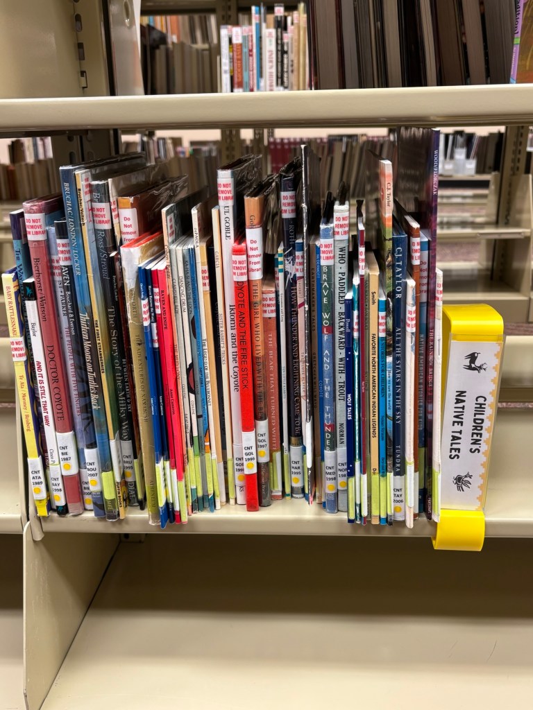 I created a spreadsheet with some genre ideas for both children and teens and started going through the youth collection, entering each book into one of the genres on the spreadsheet. I found that one of the most difficult aspects of genrefying an Indigenous collection for youth is that many of the older books frame Native nations in the past tense or cover nations from all over North America. It is difficult to decide whether or not to move these to history or culture, and definitely requires examining the books on a case by case basis.