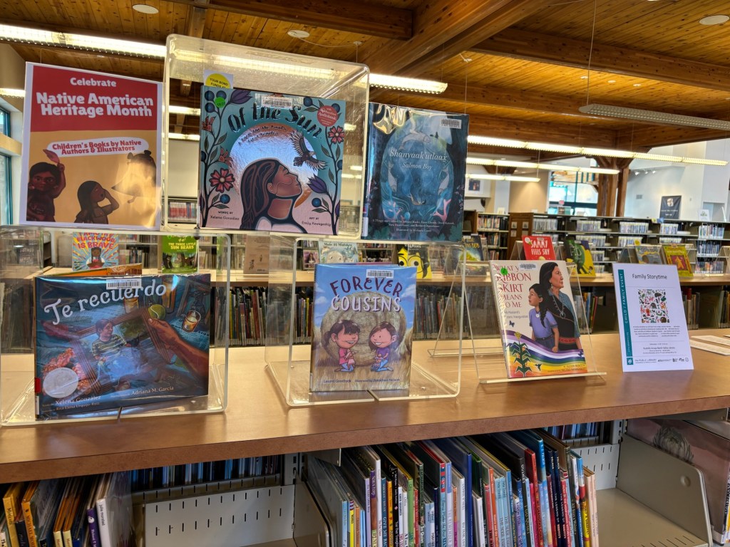 This month I’m doing a Native American Heritage Month display at my library branch featuring books by Native authors and illustrators. I wanted to share the list* I made for other librarians, teachers, and families!